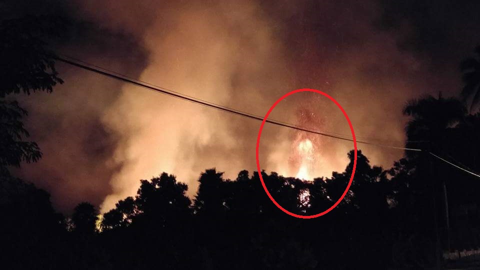 En una extraña madrugada cuando todo mundo dormía en Santiago, comenzaría nuevamente un incendio en la Zona de los Palmares, Como ya se había informado vía redes sociales el Subsecretario de Protección Civil Carlos Alfredo Godínez León subió primero el aviso sobre el protocolo de conato de incendio y media hora después en su perfil de Facebook subiría dos imágenes, la primera era una muestra clara, de que había fuego en LOS PALMARES, que se alcanza a apreciar a la izquierda es una fotografía normal, se puede observar a lo lejos las el color de las llamaradas así como una casa de dos plantas, y una extraña luz verde que seguramente se trató de algún error, o un foco de este color, así como también una persona a lo lejos afuera de su casa observando el fuego. En la segunda imagen se puede observar claramente que se forma entre el humo y las llamaradas una extraña figura con forma de cristo rezando.