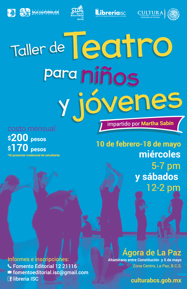 El Gobierno del Estado, la Secretaria de Cultura, el Instituto Sudcaliforniano de Cultura a través de la Coordinación de Fomento Editorial, hacen una cordial invitación al taller “Teatro para niños y jóvenes”.