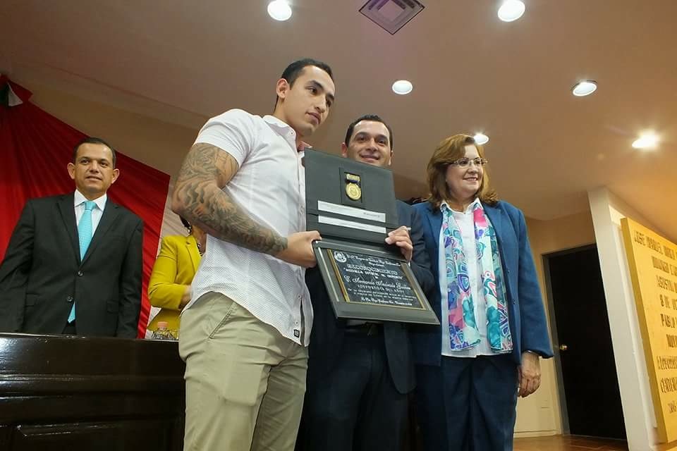 El nadador paraolímpico Luis Armando Andrade recibe el Premio Estatal de la Juventud y la Medalla a la Excelencia Deportiva de manos de la Diputada Diana Vonborstel y del Diputado Edson Gallo Zavala.