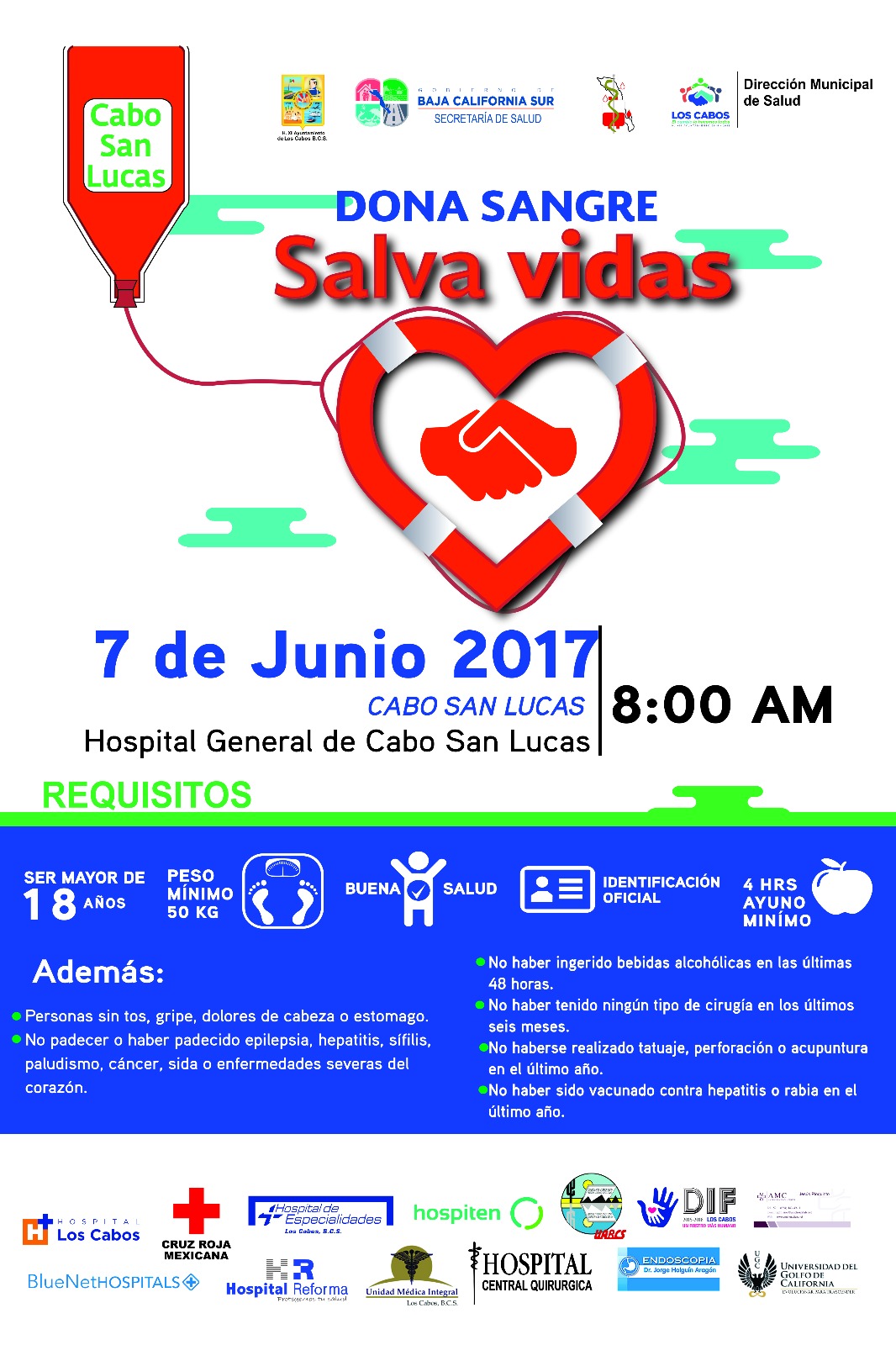 El H. XII Ayuntamiento de Los Cabos a través de la Dirección Municipal de Salud realizará una campaña de donación de sangre “Dona Sangra, Salva Vidas” con el objetivo de concientizar a la ciudadanía del municipio sobre el problema del faltante de donadores en los bancos de sangre y la necesidad de la misma, el evento que se desarrollará el miércoles 7 de junio a las 8:00 de la mañana en las instalaciones del Hospital General en la delegación de Cabo San Lucas.