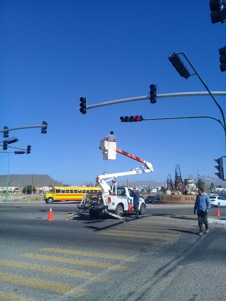 Con la conclusión en la etapa de colocación de estructuras metálicas y cabezales de luces, la Dirección General de Seguridad Pública, Policía Preventiva y Tránsito Municipal reporta un avance importante en los trabajos de instalación de los nuevos semáforos inteligentes, los cuales se ubican en distintos puntos del Boulevard Forjadores de Sudcalifornia, principal vía de acceso hacía el centro de la ciudad de La Paz.