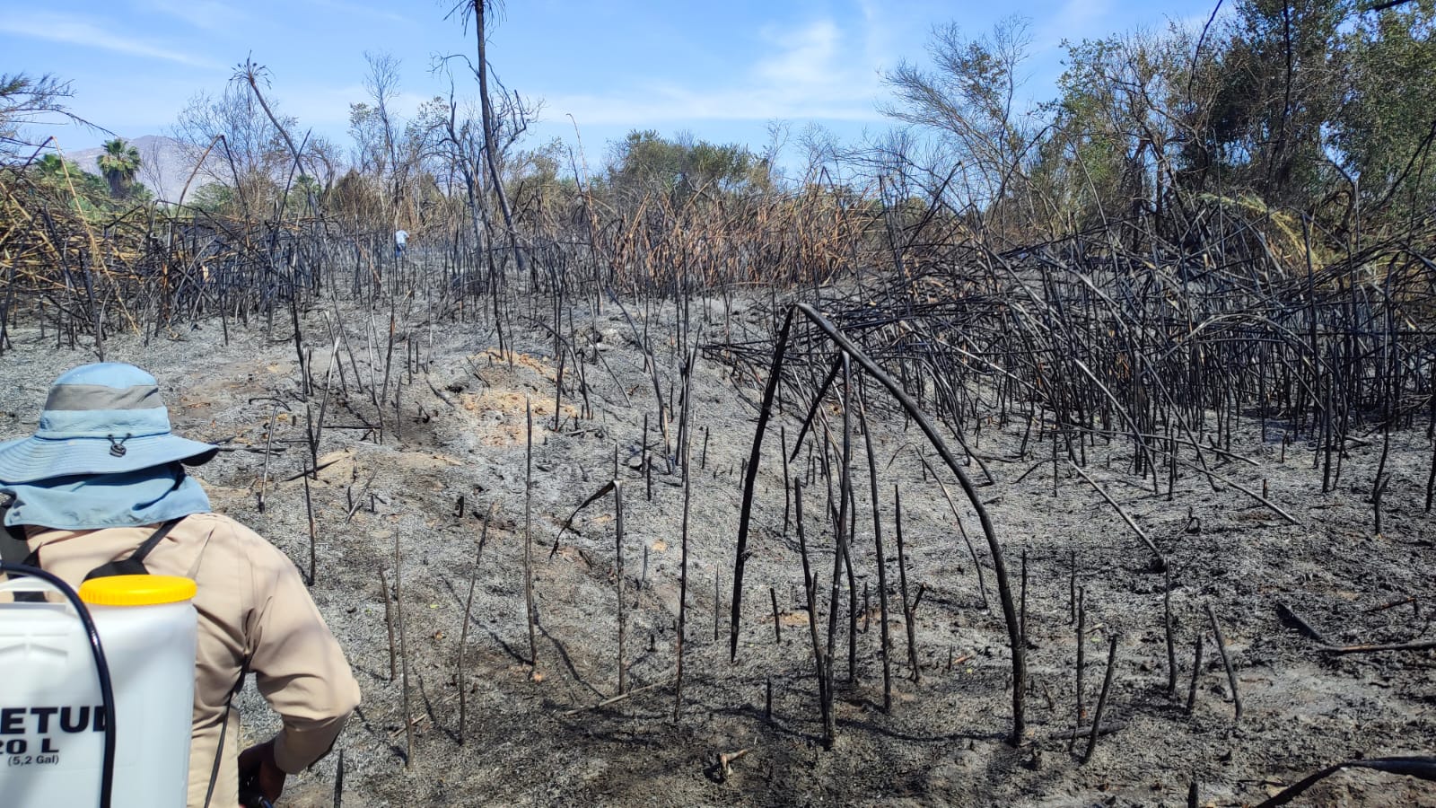 Los Cabos, B.C.S., 18 marzo 2023.- Personal de la Dirección General de Ecología y Medio Ambiente que encabeza Raúl Verdugo Montaño, llevó a cabo un recorrido por la zona que resultó afectada tras el incendio ocurrido este lunes en las inmediaciones del área natural protegida Estero de San José del Cabo, con la finalidad de verificar que el área este totalmente apagada y de esta forma llevar a cabo el recuento de los daños en materia ecológica.