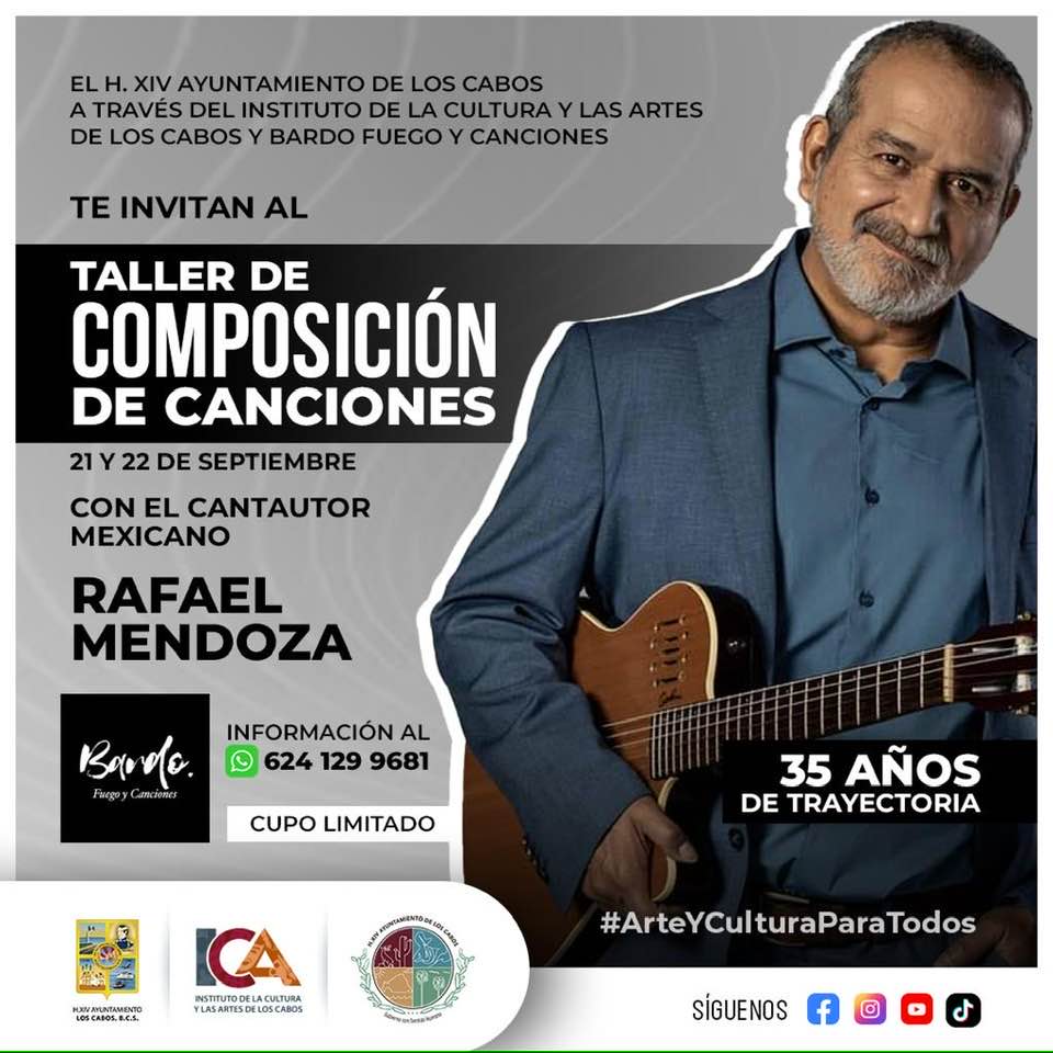 Los Cabos, B.C.S., 20 de septiembre 2023.- Como parte del festejo del 3er Aniversario de Bardo Fuego y Canciones, el XIV Ayuntamiento de Los Cabos a través del Instituto de la Cultura y las Artes de Los Cabos (ICA), estará realizando el Taller de Composición de Canciones con el cantautor mexicano Rafael Mendoza, uno de los compositores mexicanos más importantes del país, este 21 y 22 de septiembre para 15 personas en la Casa de la Cultura “Profesor Alfredo Green González” de San José del Cabo.