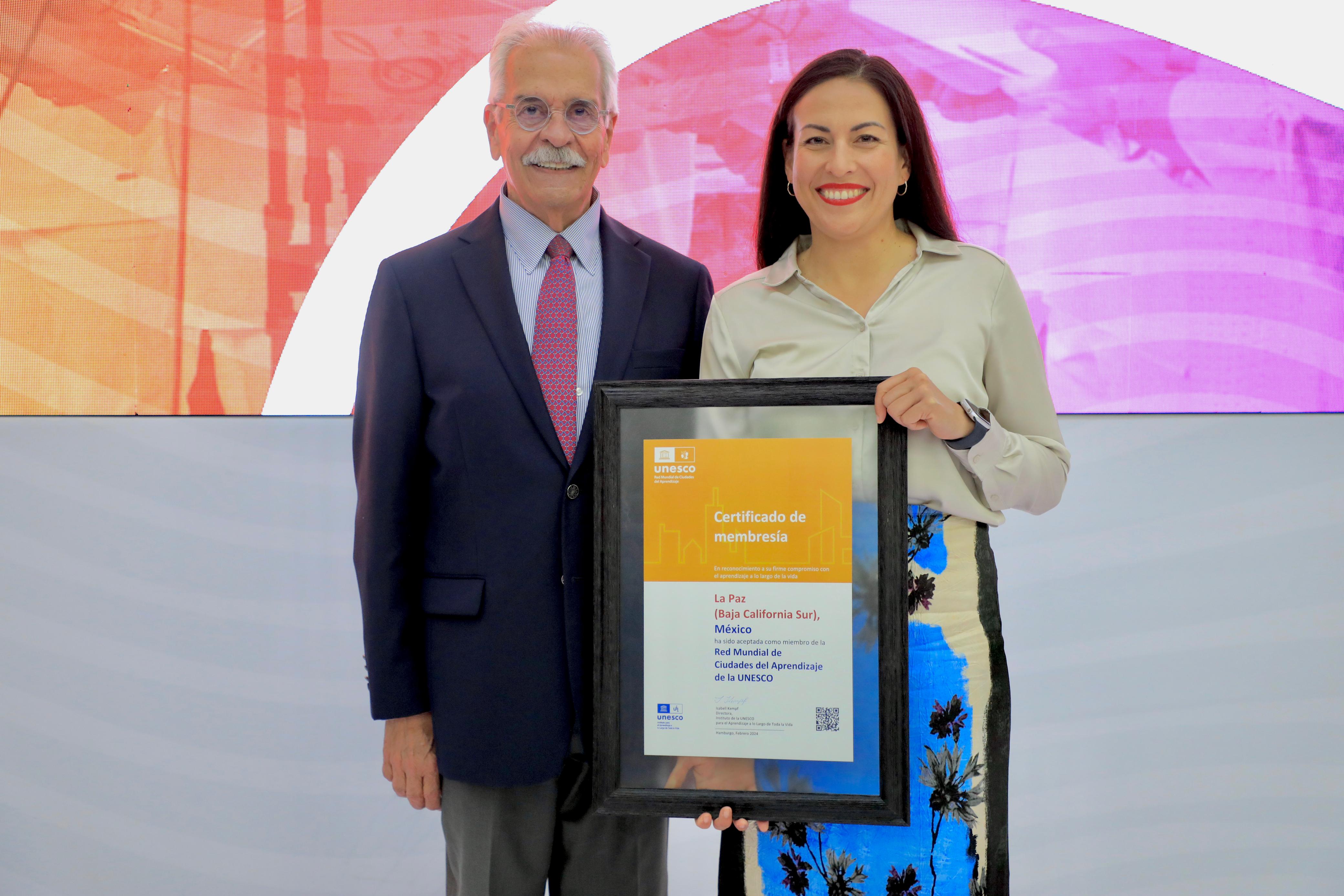 El H. XVII Ayuntamiento de La Paz recibió el nombramiento oficial como Ciudad del Aprendizaje de la Organización de las Naciones Unidas para la Educación, la Ciencia y la Cultura (UNESCO, por sus siglas en inglés), durante la ceremonia, la Alcaldesa, Milena Quiroga Romero, sostuvo que este reconocimiento corrobora los esfuerzos conjuntos que han venido realizando la Administración Municipal, ciudadanía, organizaciones civiles, sector privado y academias, por la defensa y protección del municipio.
