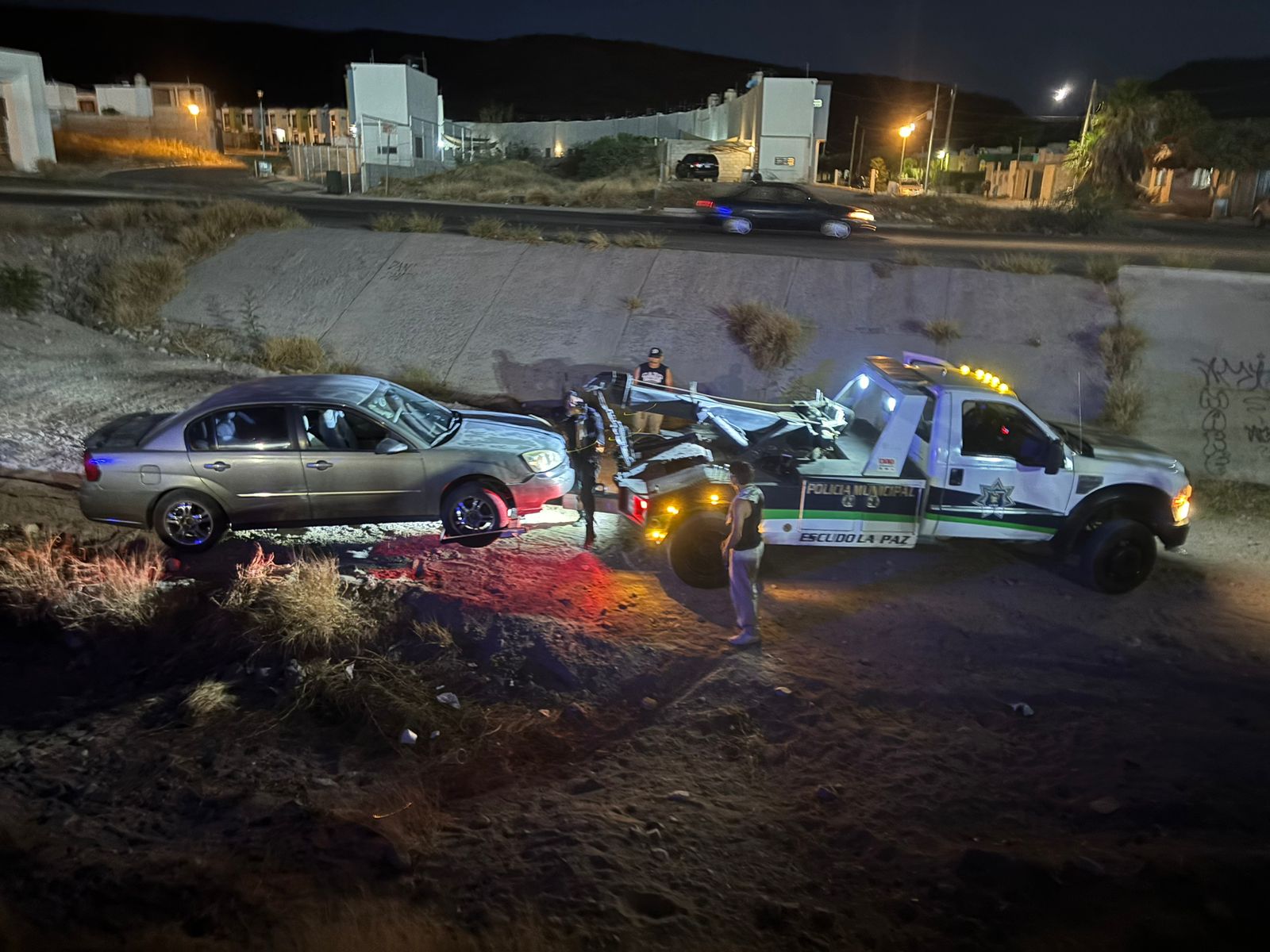 Al arribar al lugar, elementos de la Policía Municipal localizaron un Chevrolet Malibu modelo 2005 sin placas, severamente dañado tras impactarse contra una guarnición y caer en un arroyo.