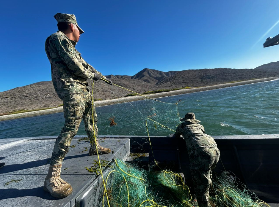 Lo anterior, se llevó a cabo durante un patrullaje de vigilancia marítima en el Golfo de Ulloa, así como en el complejo lagunar de las Bahías Magdalena, Almejas y Santa María, realizado en coordinación con personal de la Comisión Nacional de Acuacultura y Pesca (CONAPESCA) de la Secretaría de Agricultura y Desarrollo Rural, para combatir la pesca ilegal no declarada y no reglamentada, por lo cual se realizó la retención precautoria de las artes de pesca que no cumplían con la Norma Oficial Mexicana.