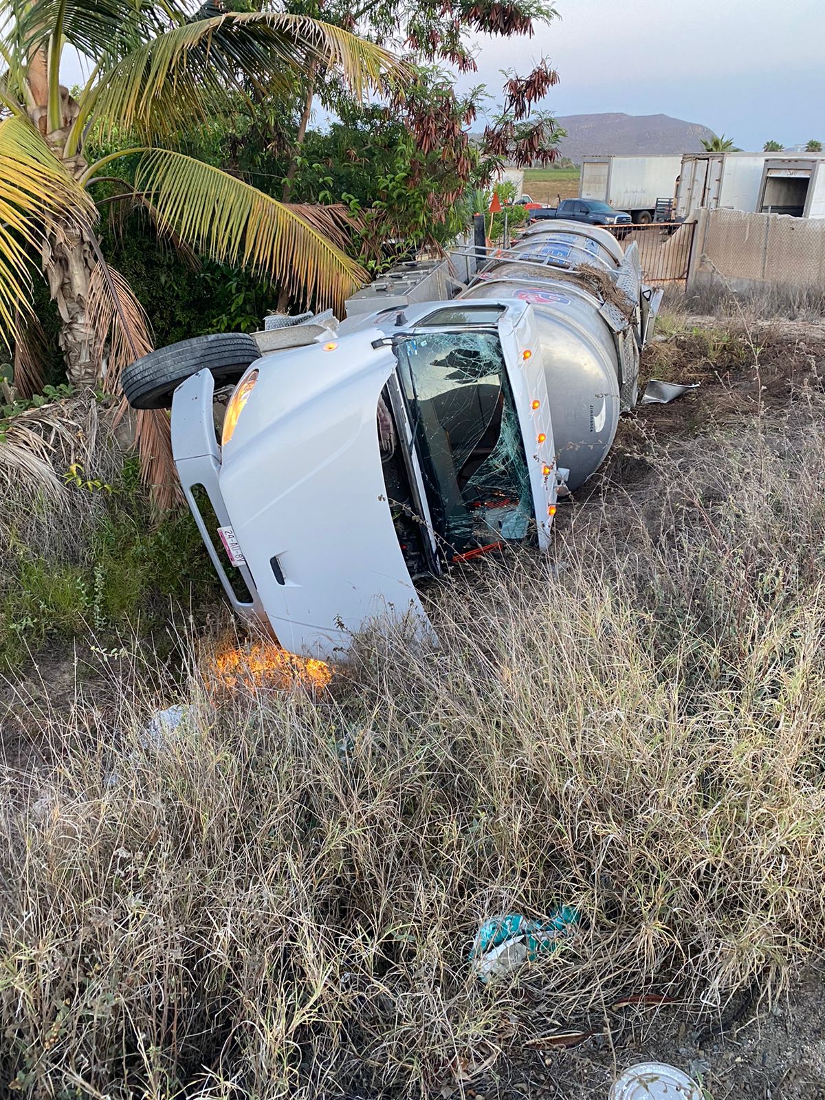 De acuerdo con el reporte de la Policial, el incidente ocurrió alrededor de las 05:30 horas. Al arribar al lugar, los agentes encontraron una pipa marca Freightliner, modelo 2021, con placas de circulación 24AU8V, propiedad de Combustibles Baja Sur S.A. de C.V., volcada sobre su costado derecho.