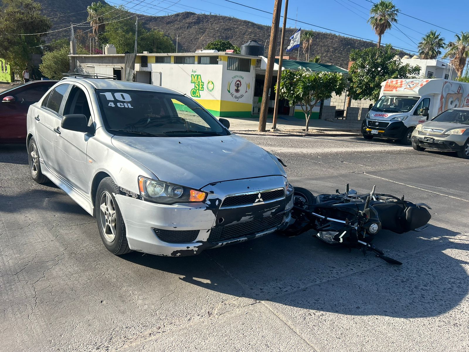Una motocicleta fue impactada por un automóvil Mazda gris, modelo 2003, sin placas de circulación. La conductora del automóvil, María Daniela «N», de 20 años, y el motociclista, Brayan Martínez «N», de 19 años, ambos originarios de La Paz, se vieron involucrados en el incidente.