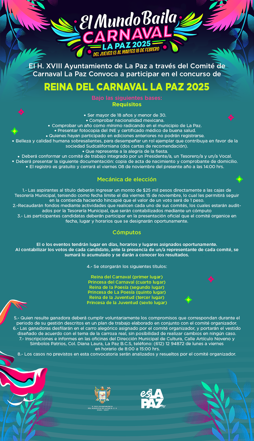 Para más información, las interesadas pueden consultar las bases en las redes sociales oficiales del Carnaval La Paz y de la Dirección Municipal de Cultura, así como en la página oficial del Ayuntamiento de La Paz.