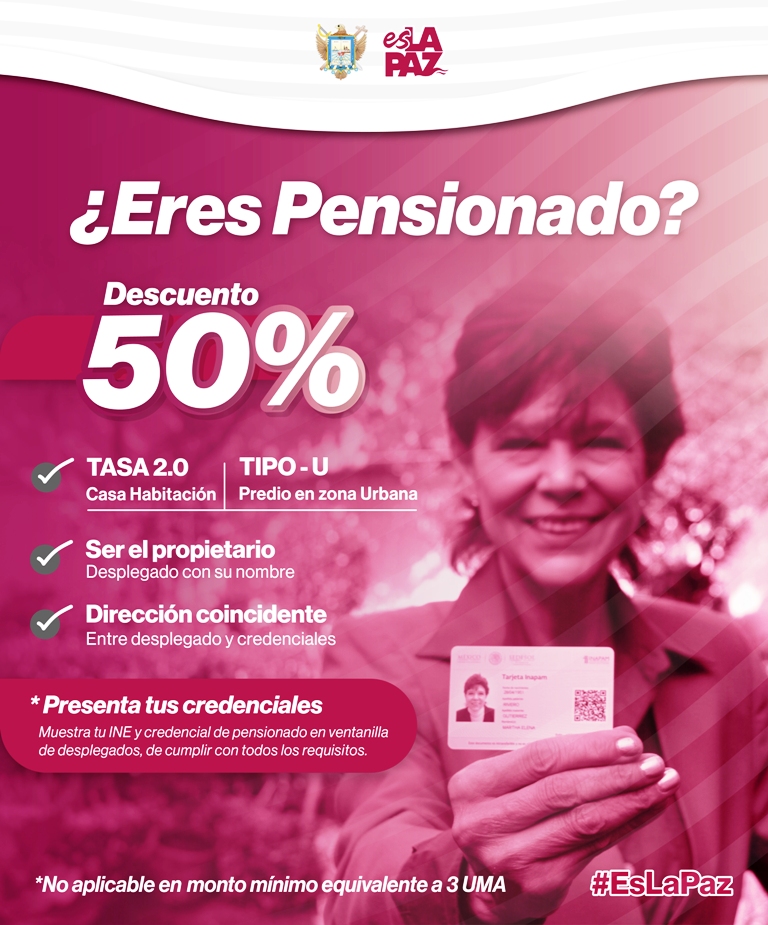 Con la finalidad de brindar apoyo a la población, el Ayuntamiento de La Paz concede un 50% de descuento en el pago de impuesto predial a los adultos mayores, así como pensionados o jubilados. Este beneficio es válido sin importar el mes del año en el que realicen el registro, únicamente presentando la documentación requerida, informó el Tesorero Municipal, Jassiel Enríquez Varela.