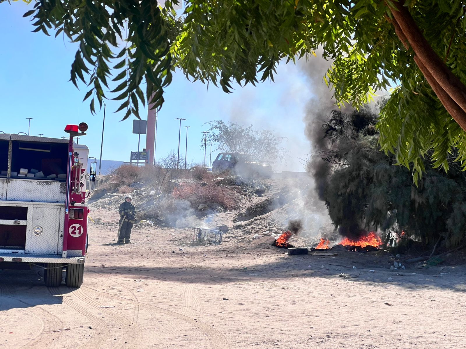 Al arribar al lugar, los oficiales encontraron a personal del cuerpo de bomberos, a bordo de la unidad extintora número 21, trabajando para controlar las llamas. Gracias a su rápida intervención, se logró sofocar el incendio sin mayores incidentes.