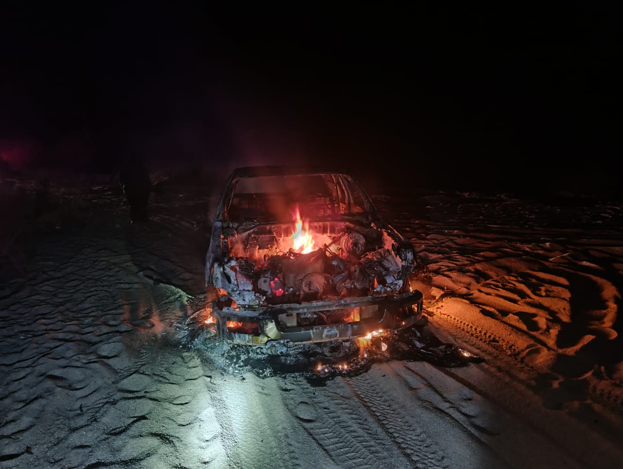 La Paz, BCS. – Elementos de la Policía Municipal localizaron la noche del pasado lunes un vehículo calcinado en el kilómetro 19 de la carretera que conduce a Los Planes, cerca del vado conocido como El Toreador.