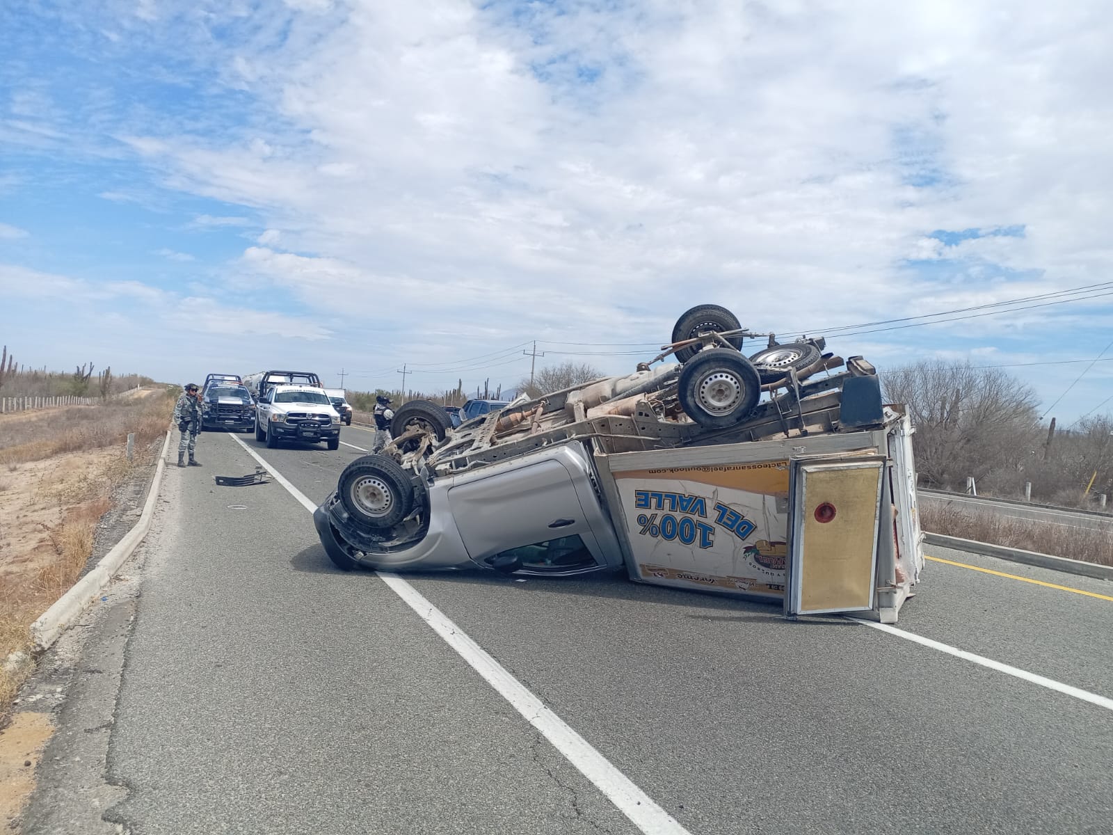 Volcadura de Camión de Carga en la Carretera La Paz-Todos Santos por fortuna sin lesionados.