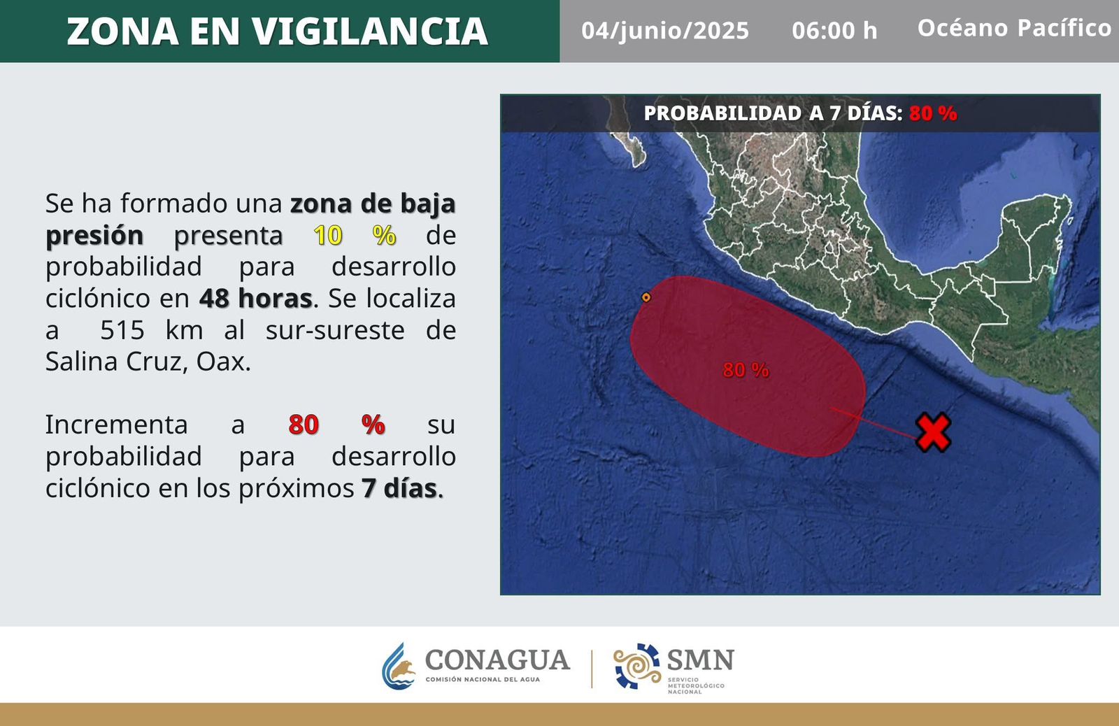 Los Cabos, Baja California Sur.- La Dirección Municipal de Protección Civil de Los Cabos informa a la ciudadanía que se encuentra en constante monitoreo de una zona de baja presión localizada en el Pacífico, frente a la costa de Chiapas, la cual presenta un 10% de probabilidad de desarrollo ciclónico en las próximas 48 horas y un 80% de probabilidad en los próximos 7 días.